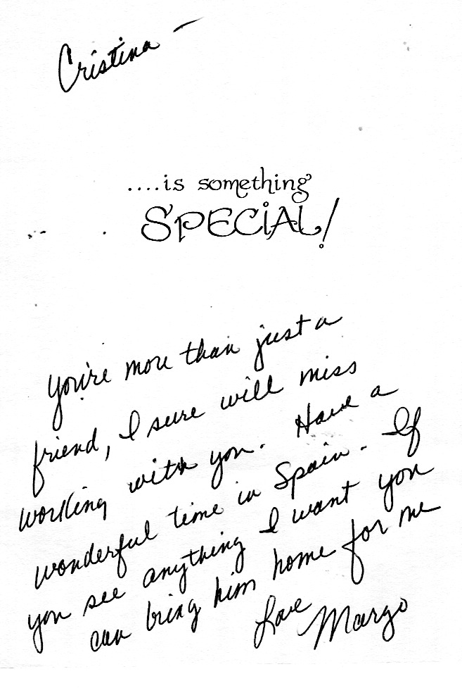 Her good friend, coworker, and tenant Margo also signed a card with a funny “If you see anything I want, you can bring him home for me”