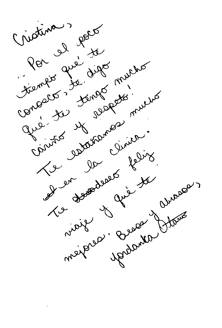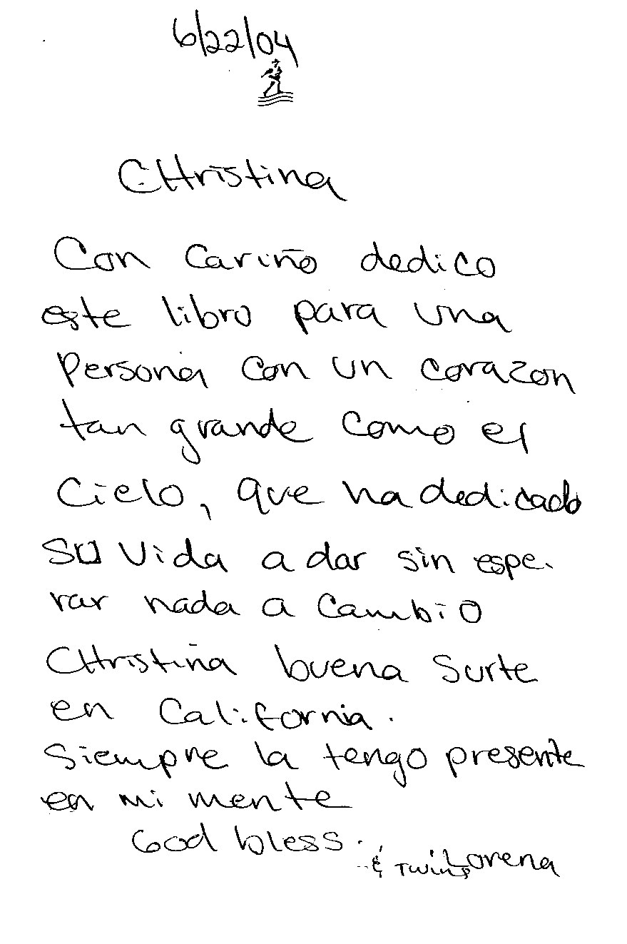 In June 2004, Cristina was well enough to move to California to have greater access to the Oncologists at Hoag Hospital in Newport Beach. She was sad to say goodbye to the friends that she made in Las Vegas and specifically at the UMC Women’s Clinic. A few of them inscribed well wishes inside books as gifts: