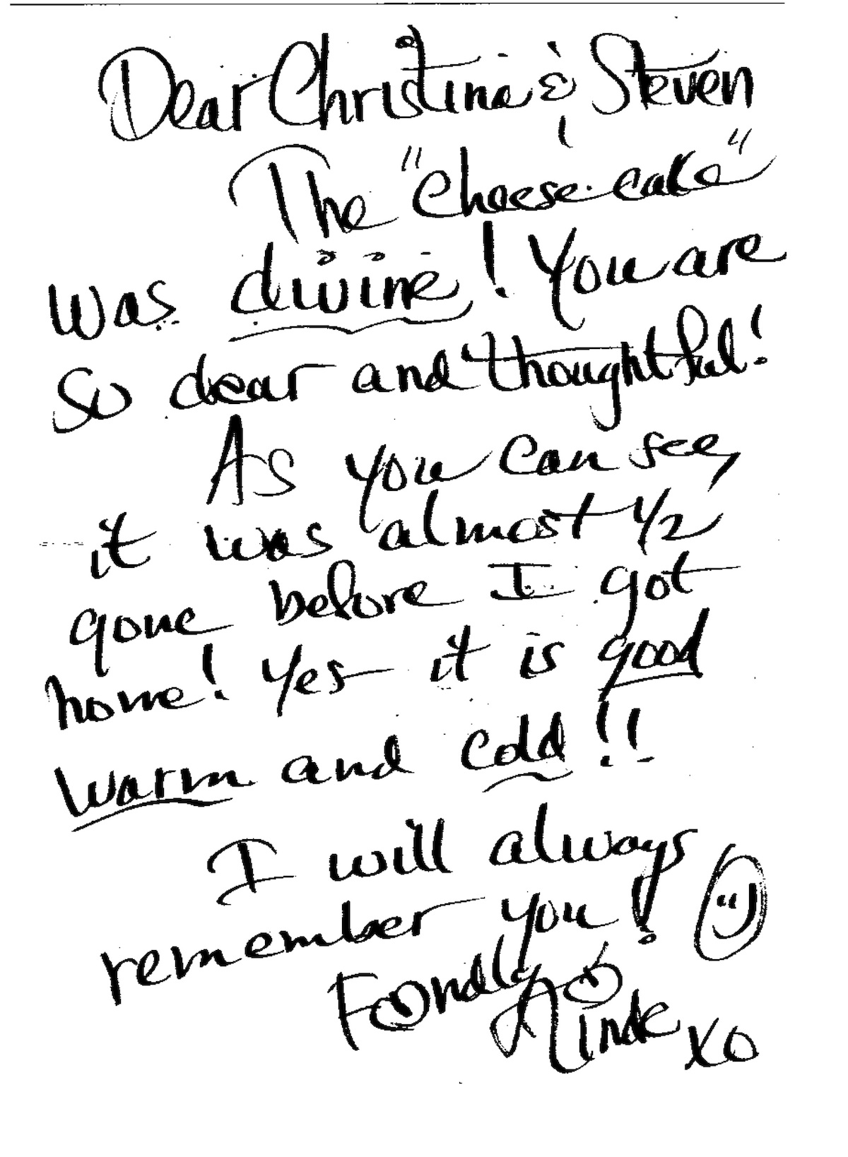 Unsure about the date or the author “Linde”, but this thank you card for one of Cristina’s cheesecakes has such great caligraphy it deserved to be posted: