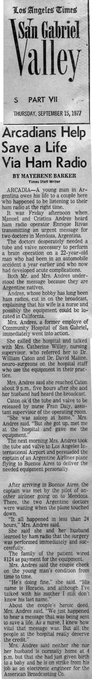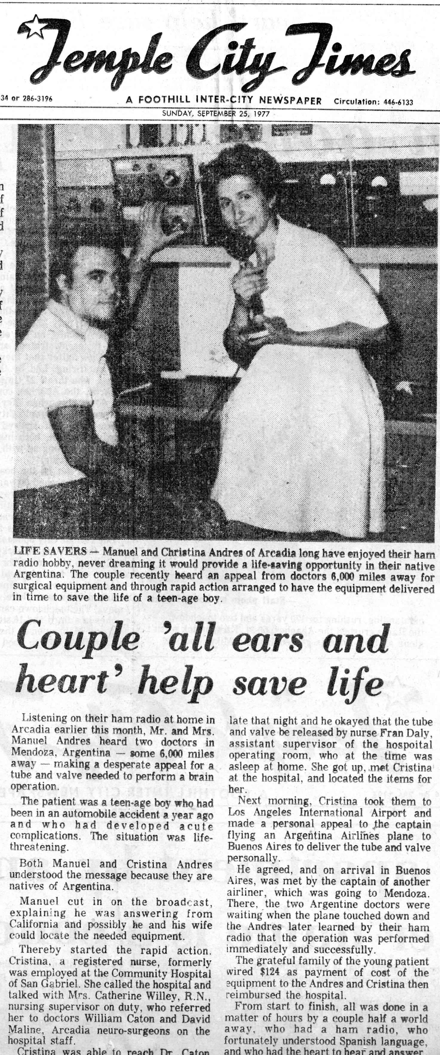 Andres, whose hobby has long been ham radios, cut in on the broadcast, explaining that his wife is a nurse and possibly the equipment could be located in California.