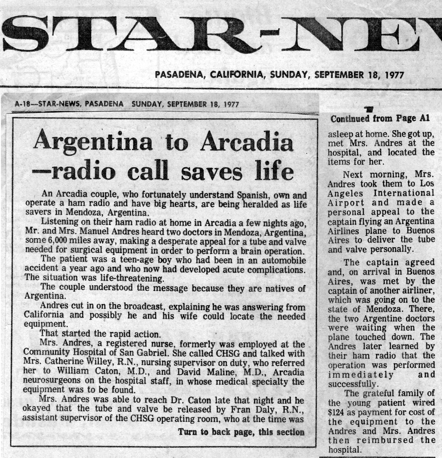 LOS ANGELES TIMES (ARCADIA) – A young man in Argentina owes his life to a couple here who happened to be listening to their ham radio at the right time.