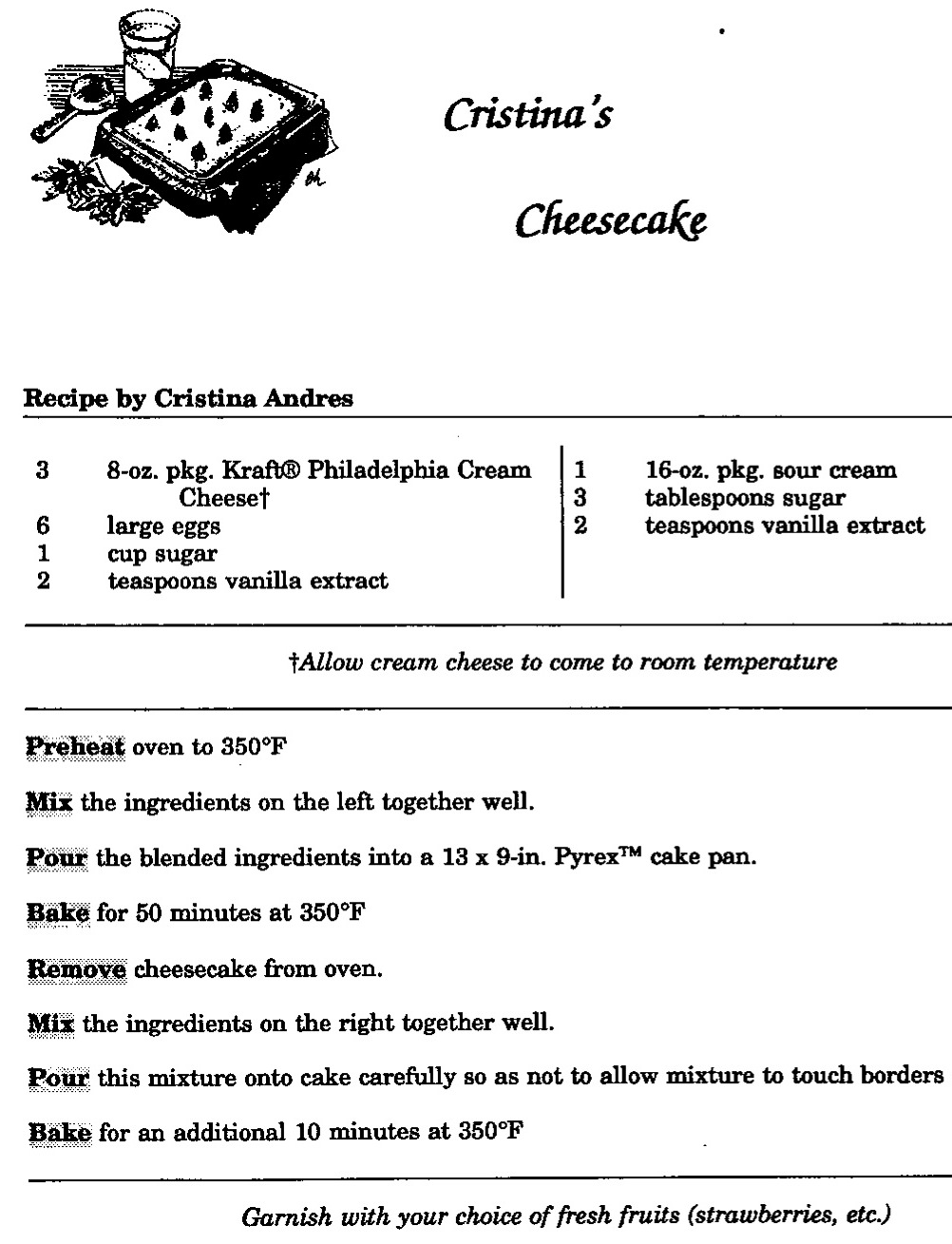 Anyone that knew Cristina also knew her famous cheesecake. It was a fan favorite at many school events at Anoakia, Barnhart, and La Salle High School. Here now, for her friends to enjoy, is Cristina’s not-so-secret recipe.