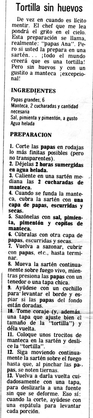 This is a Spanish tortilla/omelette (not to be confused with the Mexican corn/flour thin bread) made without eggs. So in reality, it’s just a cubed potato casserole: